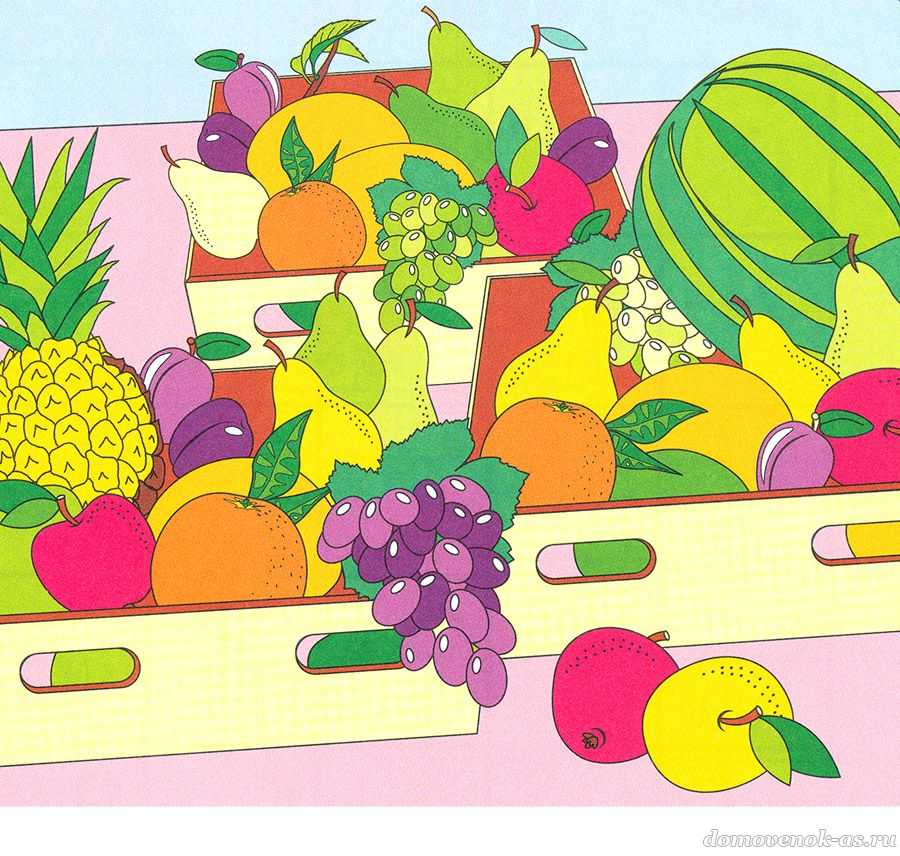 №8. Найди на картинке 10 груш, 6 слив и 5 яблок.