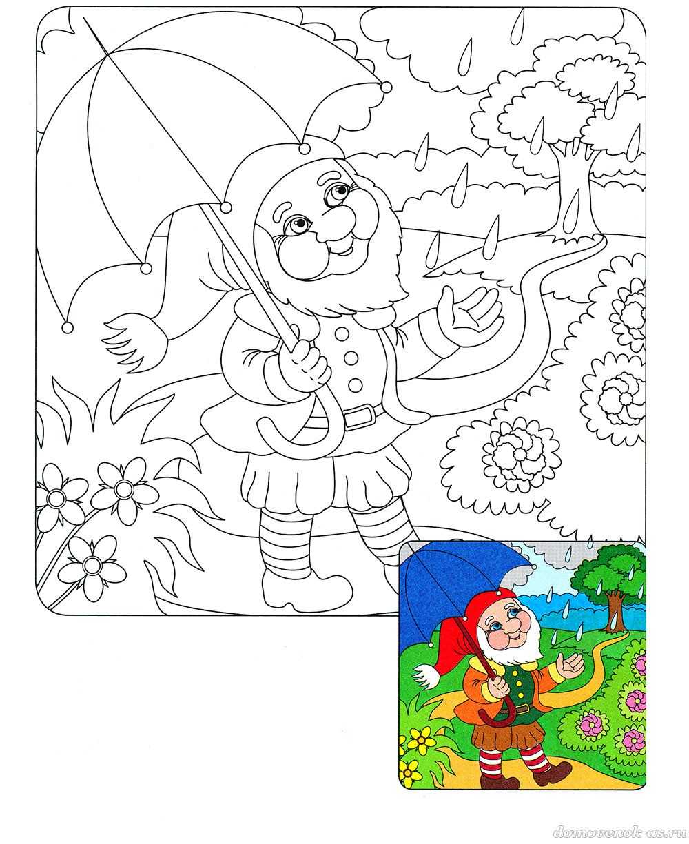 №4. Раскрась весёлого гнома по цветному образцу.