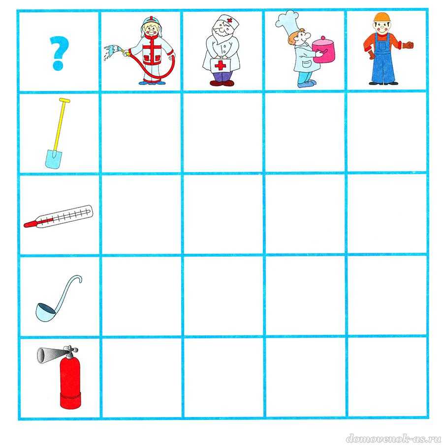 №16. А теперь сыграем в игру! Назови профессии людей, которых ты видишь наверху таблицы. Закрась клетки, где пересекаются колонки с изображением человека и предмета, который необходим ему в работе.