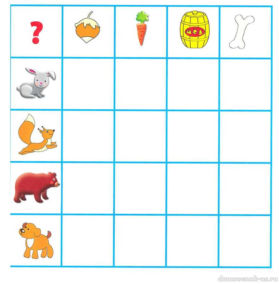 №31. Кто что ест? Закрась клетки, где пересекаются колонки с животными и их любимыми лакомствами.