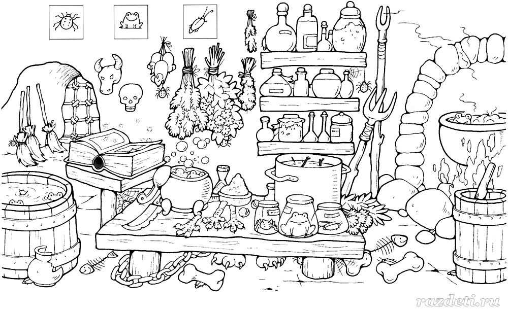 Летучие мыши спешат к колдунье… Она ждет в гости пять мышат. Дорисуй мышат и раскрась картинку!