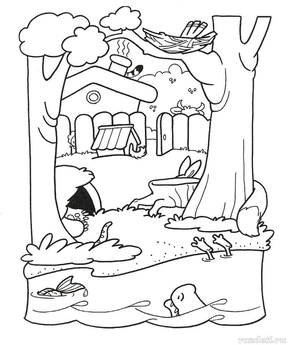 Укрась скворечник узорами и нарисуй еще персонажей Раскрась рисунок.