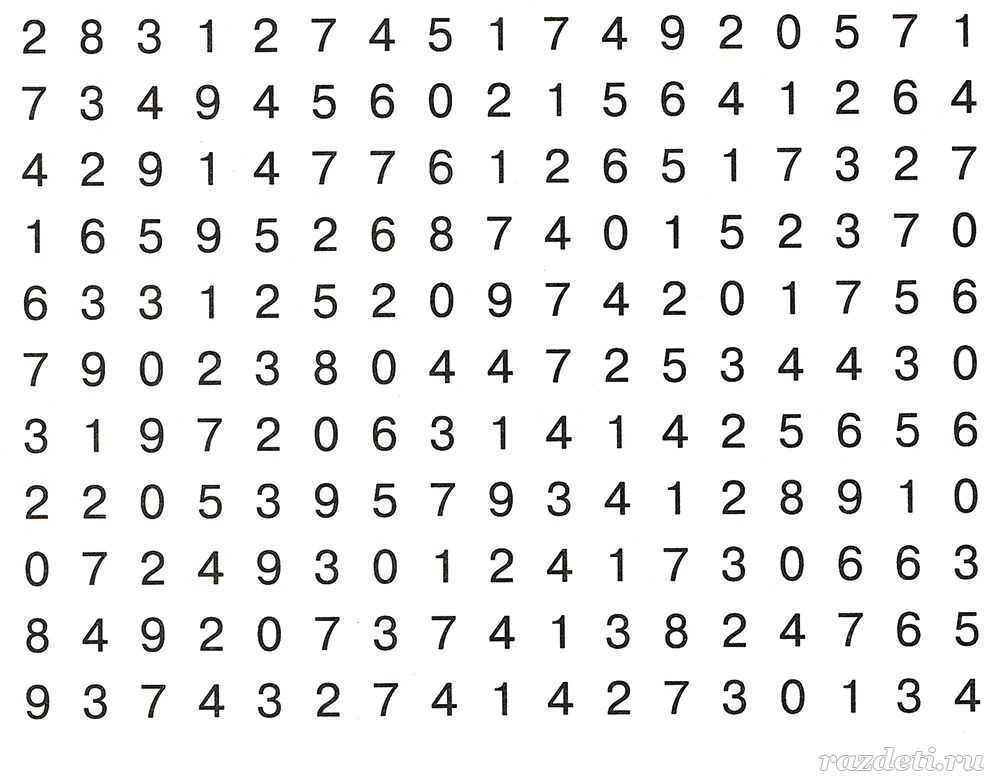 - «Раскрашиваем цифру от 0 до 9» — задания на усидчивость, в которых среди множества переплетенных чисел, нужно найти и раскрасить нужное число;