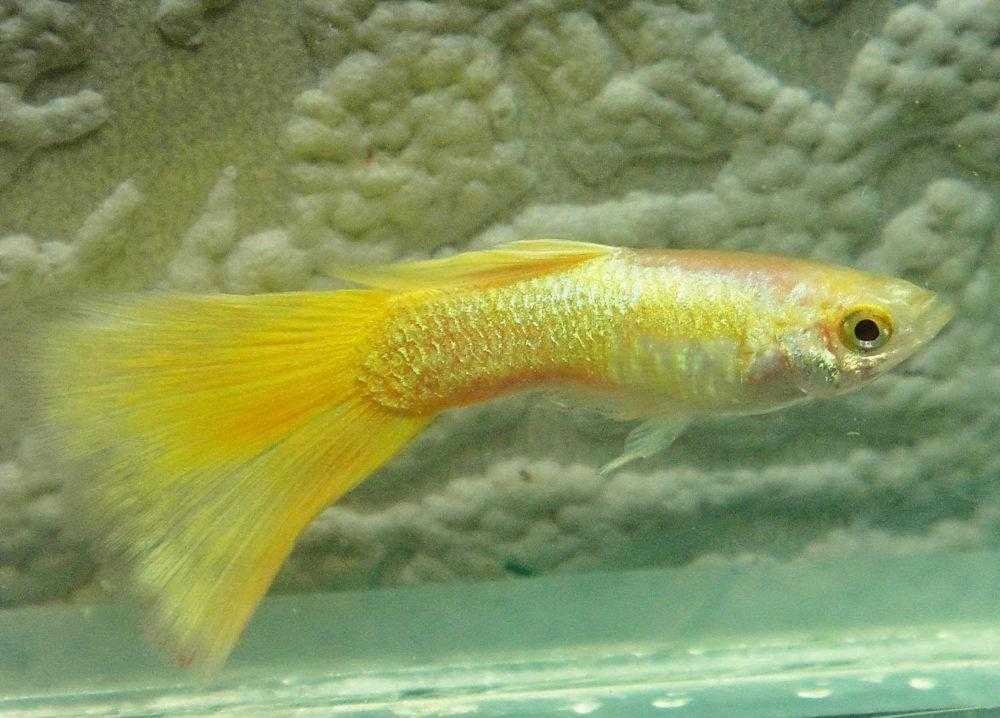 К этой группе относятся жёлтые гуппи разнообразных оттенков, но брюшко светлое, практически белое. Для самок – преобладающий цвет. Часто жёлтый цвет заменяет планируемый красный или зелёный окрас.