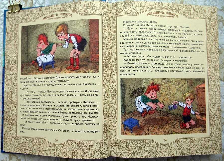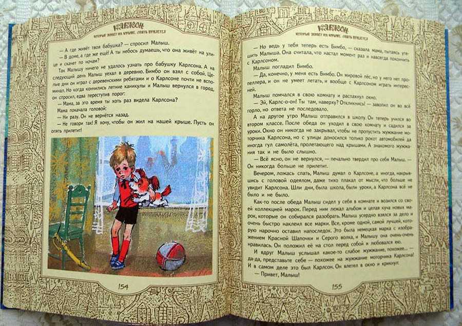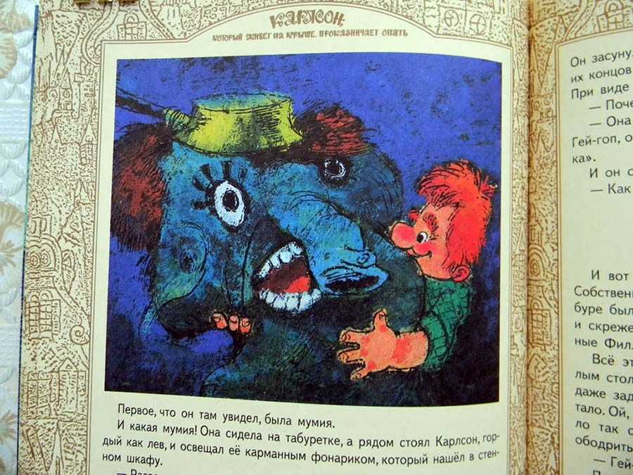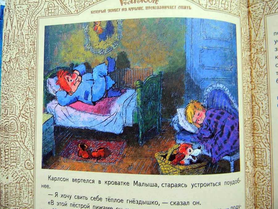 В последнее время очень много противоречивых отзывов читаю я об этой книге, основная суть которых сводится к «В детстве я обожал(а) эту книгу, а сейчас не понимаю, как ее можно любить! Карлсон такой эгоист, нахал, предатель! Нет, такую книгу я покупать ребенку не буду!».И если с первой частью такой рецензии я еще могу согласиться (сама сейчас возмущалась, когда читала, как нехорошо поступает Карлсон), то с последним предложением согласиться никак не могу.Ох и обожала я в детстве этого проказника! Причем книгу любила сильнее мультика (при всей моей любви к визуальному ряду изображений). Именно книгу, которая была у меня большого формата А4, с тусклыми цветными иллюстрациями, но…но как же врезается в память когда-то прочитанное и произведшее впечатление произведение! Сейчас открываю книгу про Карлсона и читаю: