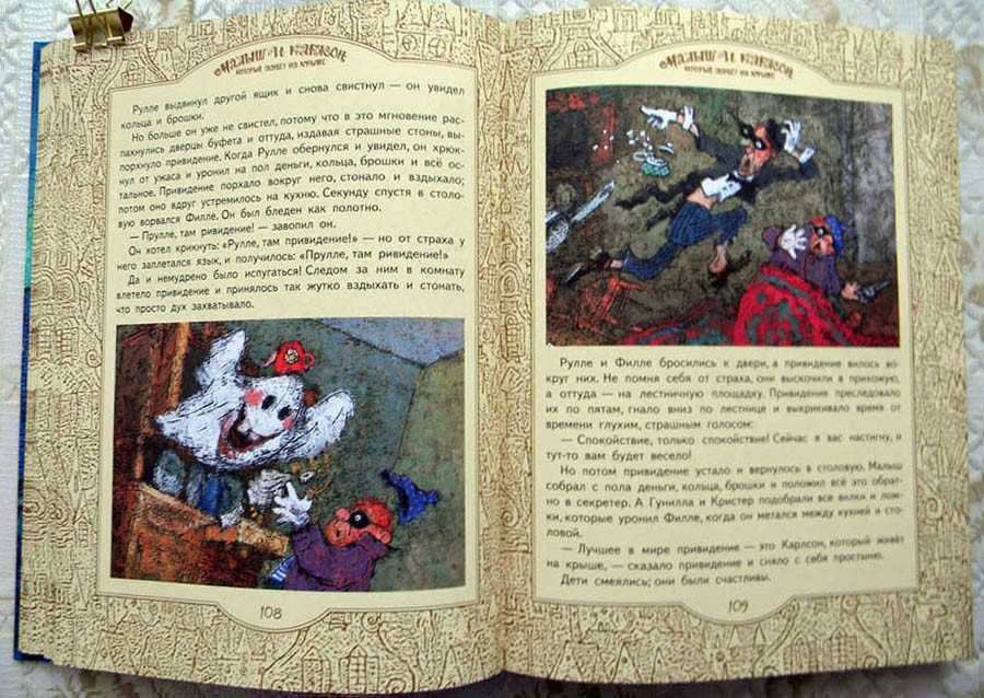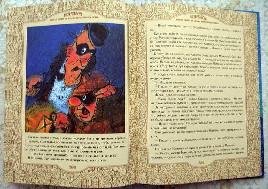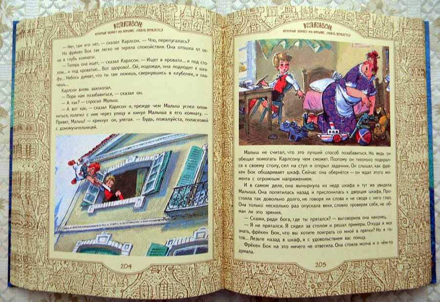 Помимо Карлсона, книга содержит сказки про Пеппи, Рони — дочь разбойника и Эмиля, но…я все-таки предпочту купить эти произведения в отличном качестве с цветными иллюстрациями по отдельности.Либо же три книжки с иллюстрациями Викланд, в которых ТОЛЬКО Карлсон:
