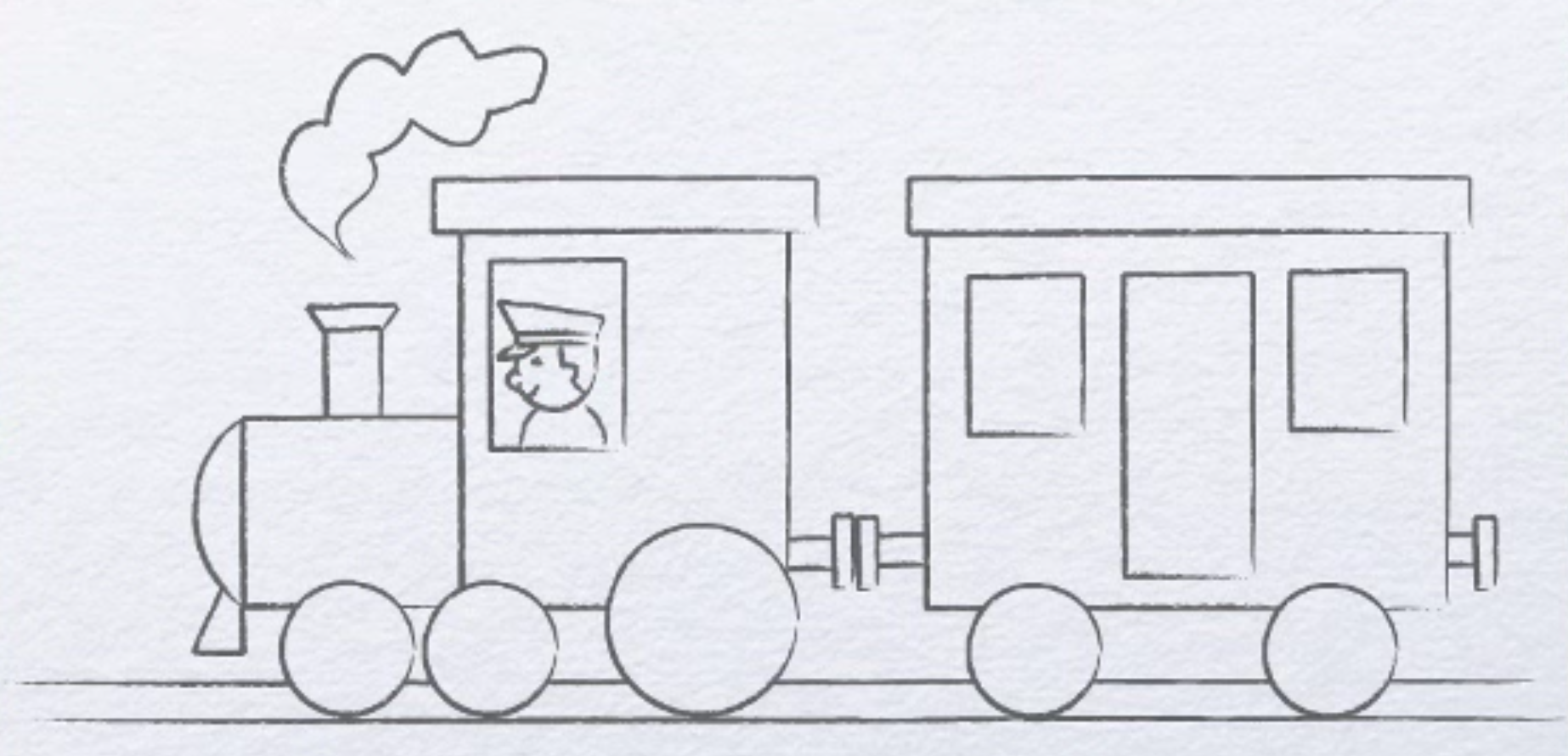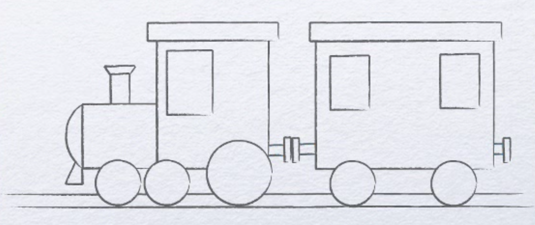 В изображении уже угадывается состав. Прибавить сходства помогут более точные детали: труба локомотива, прорисованные сцепки, соединяющие его с вагончиком, железная дорога.
