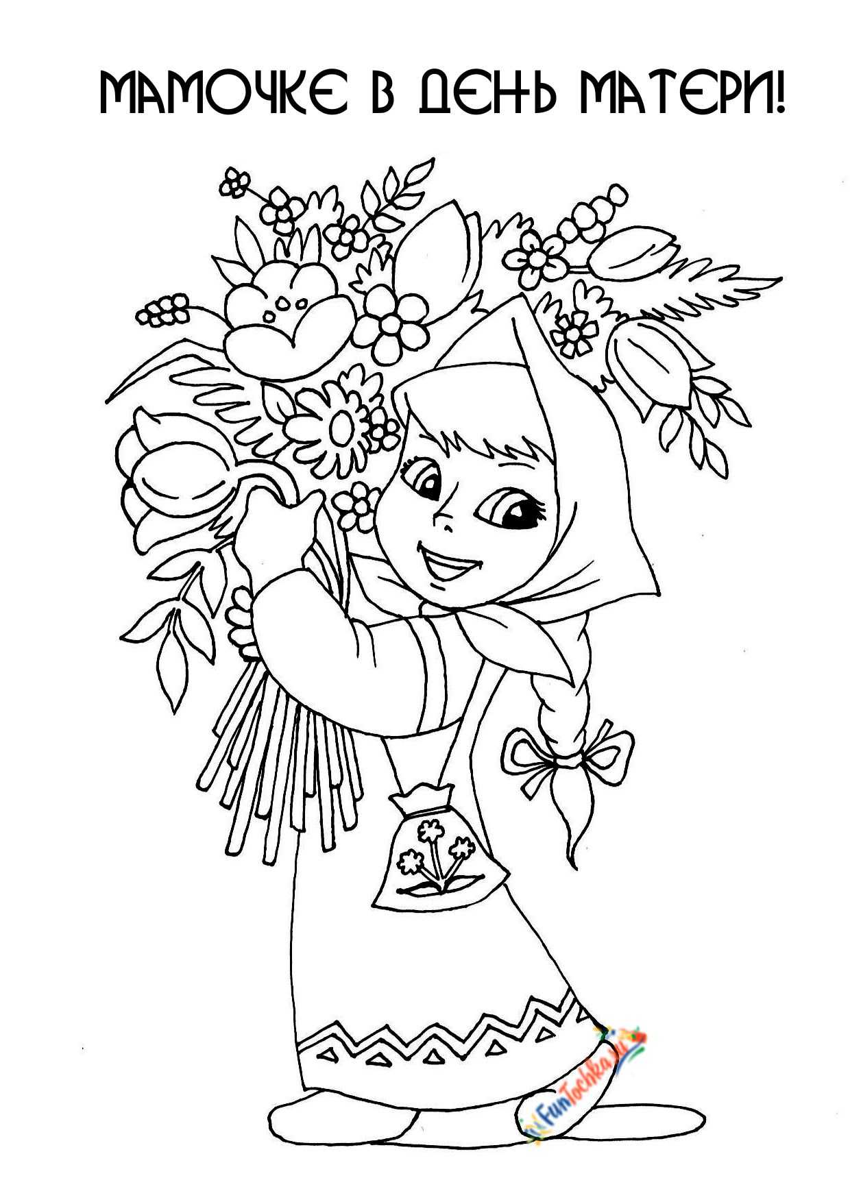 Сказочный и очень славянский сюжет — красивая девочка в сарафане с полевыми цветами для самой любимой в День матери. Детали мелкие, раскрашивать тут нужно не мало. Предлагайте картинку детям с 1 класса и выбирайте карандаши, мелки или фломастеры, если хотите, чтобы удалось закончить сюрприз за одно занятия.