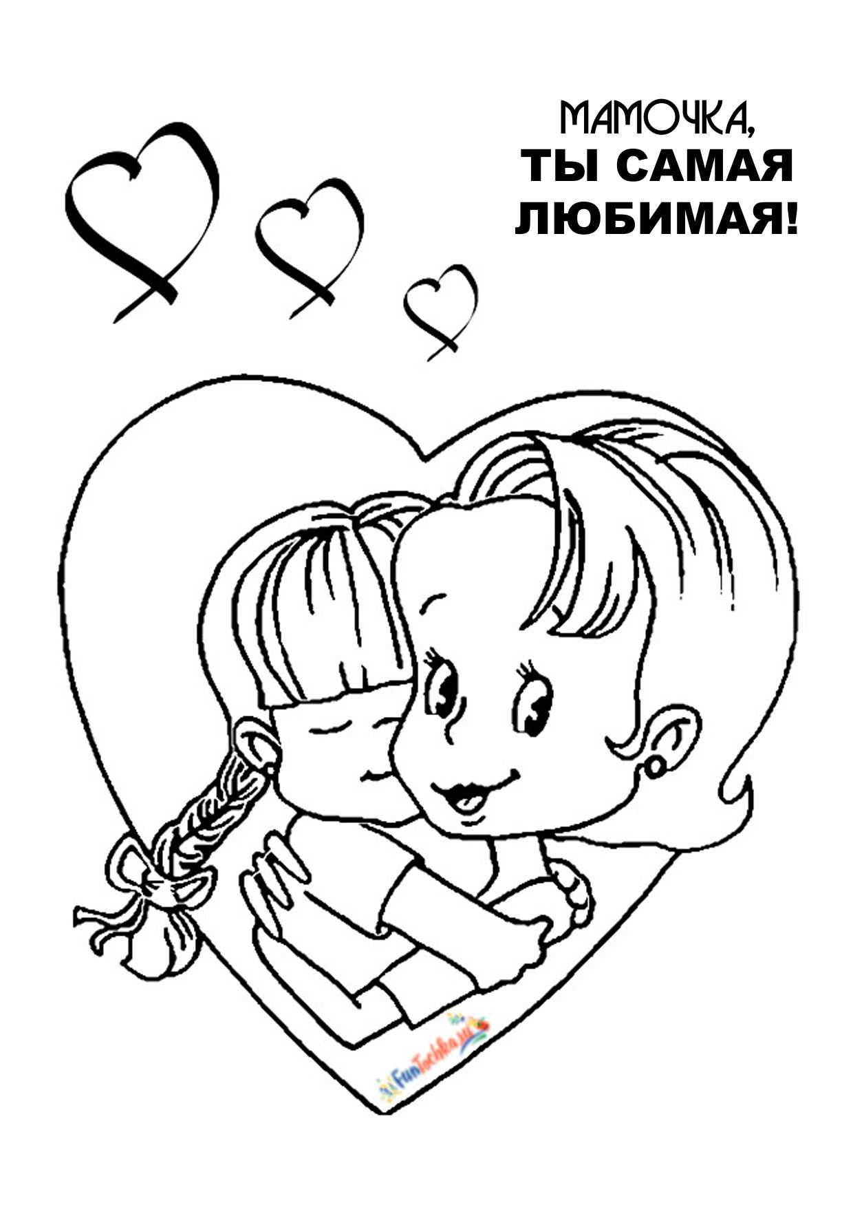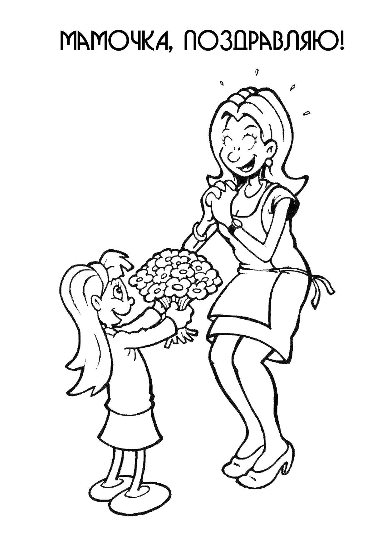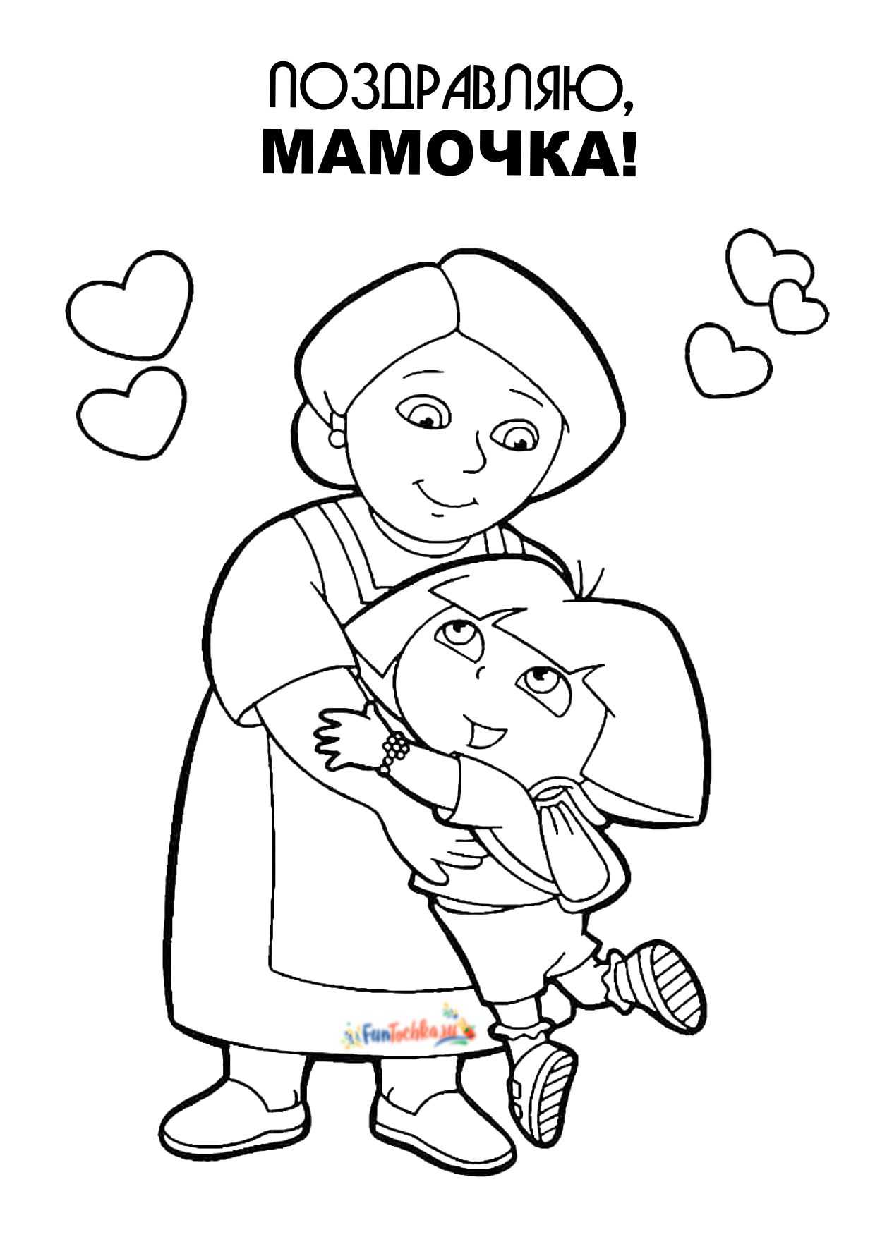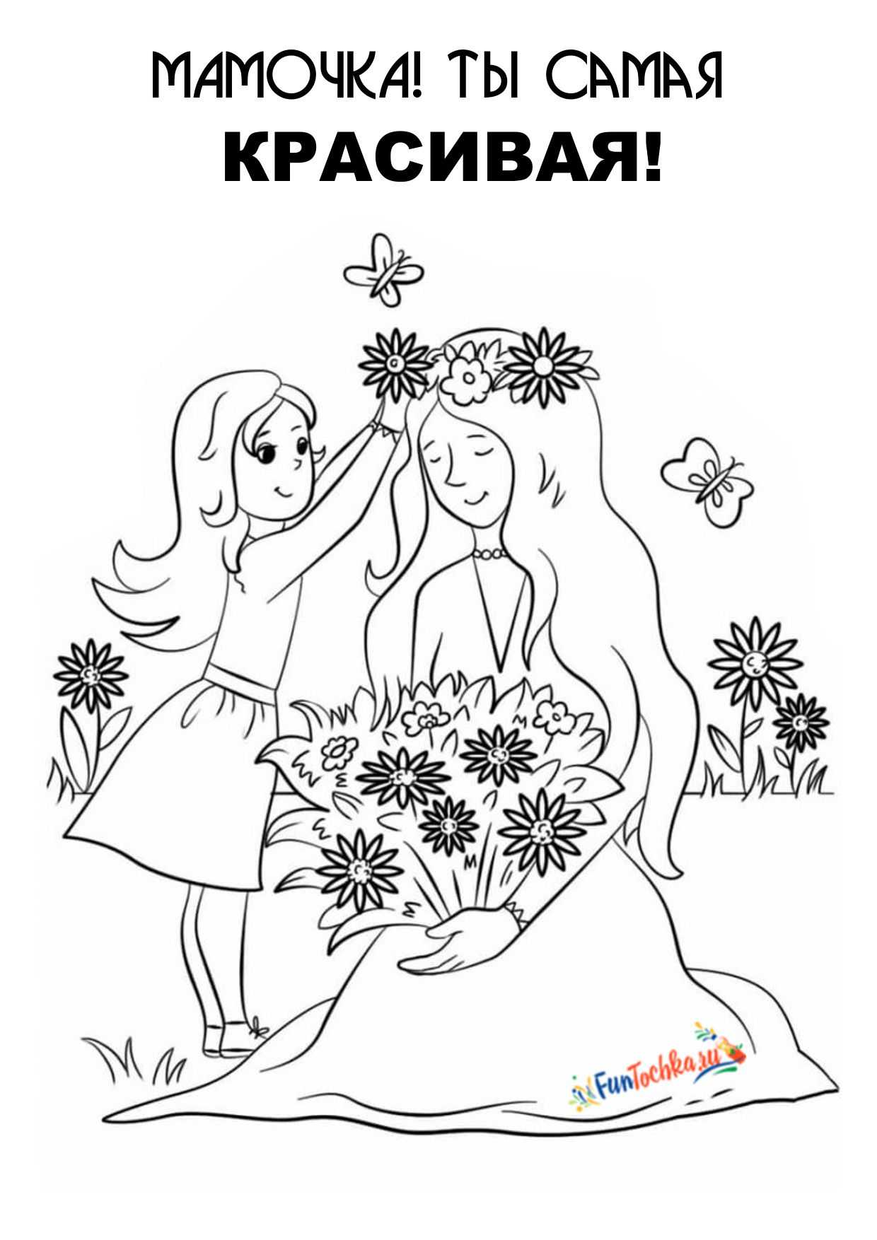 Еще одна яркая по настроению бесплатная раскраска для дочки и мамы. В ней так много восторга к центру детской Вселенной, что поздравить знакомых женщин с Днём матери захочется даже взрослому.