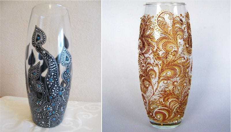 Для тех, кто не ищет легких путей и желает украсить вазу более сложным рисунком, предлагаем освоить технику точечной росписи, которая также называется пике или point-to-point.