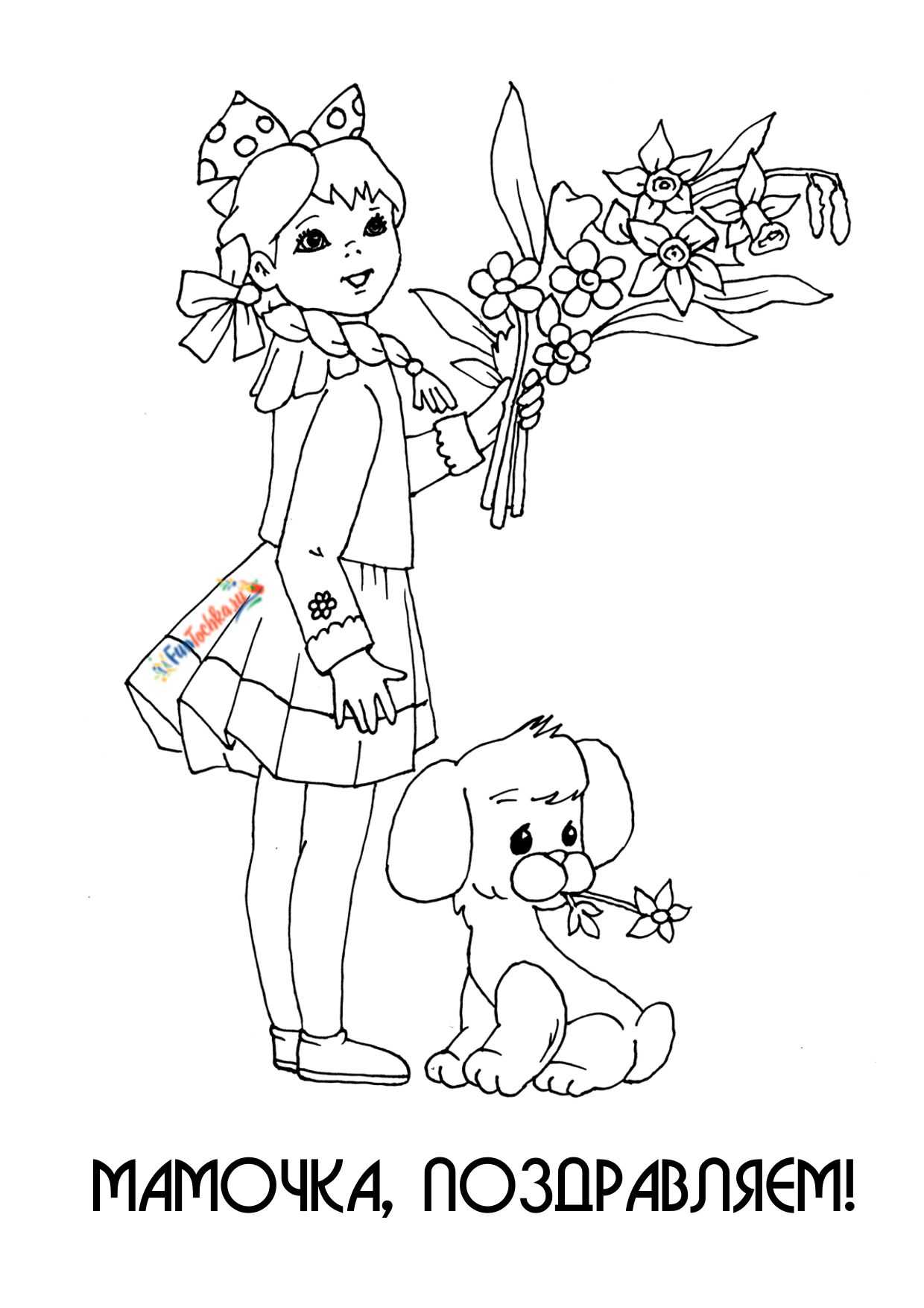 Поздравляем, поздравляем! Счастья и любви желаем! — бегут навстречу маме дочка и беззаботный щенок. Кому близка эта трогательная до слез картина? Скачайте и распечатайте нашу красивую раскраску на День матери.