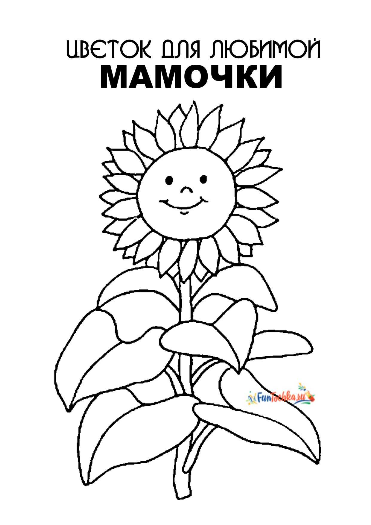 Большому подсолнуху всегда найдется место в идеях маленького художника. Сюжет поздравления вроде бы элементарный, но деталей в шаблоне не мало. Удобный размер лепестков под красочные фломастеры вдохновляет сделать подсолнух феерически разноцветным. Попробуем, а? Красивый подарок получится на День матери!