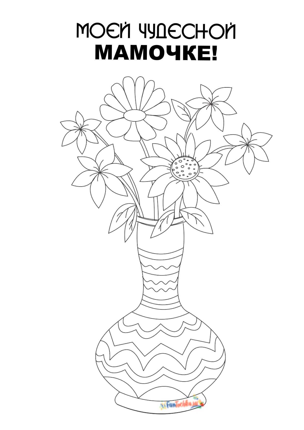 Трудоемкая и уже очень близкая к взрослому образцу раскраска на день Матери. Каждый цветок в вазе требует внимания. Есть тонкие контуры и элементы орнамента. Надеемся, вам пригодятся и эти красивые шаблоны. Школьники и преданные фанаты раскрашивания оценят!