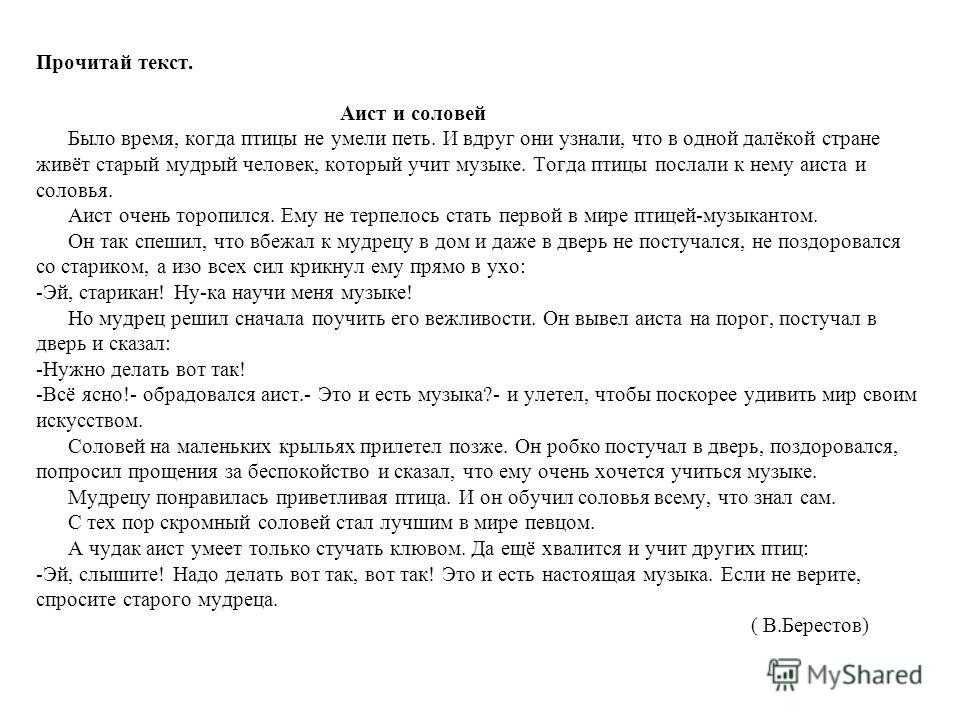 Прочитай текст. Аист и соловей Было время, когда птицы не умели петь. И вдруг они узнали, что в одной далёкой стране живёт старый мудрый человек, который учит музыке. Тогда птицы послали к нему аиста и соловья. Аист очень торопился. Ему не терпелось стать первой в мире птицей-музыкантом. Он так спешил, что вбежал к мудрецу в дом и даже в дверь не постучался, не поздоровался со стариком, а изо всех сил крикнул ему прямо в ухо: -Эй, старикан! Ну-ка научи меня музыке! Но мудрец решил сначала поучить его вежливости. Он вывел аиста на порог, постучал в дверь и сказал: -Нужно делать вот так! -Всё ясно!- обрадовался аист.- Это и есть музыка?- и улетел, чтобы поскорее удивить мир своим искусством. Соловей на маленьких крыльях прилетел позже. Он робко постучал в дверь, поздоровался, попросил прощения за беспокойство и сказал, что ему очень хочется учиться музыке. Мудрецу понравилась приветливая птица. И он обучил соловья всему, что знал сам. С тех пор скромный соловей стал лучшим в мире певцом. А чудак аист умеет только стучать клювом. Да ещё хвалится и учит других птиц: -Эй, слышите! Надо делать вот так, вот так! Это и есть настоящая музыка. Если не верите, спросите старого мудреца. ( В.Берестов)