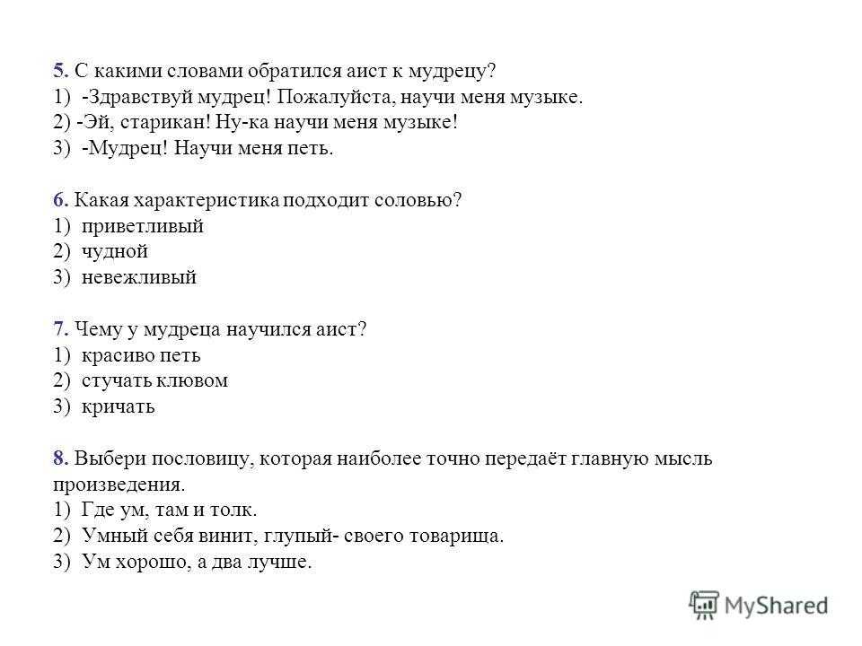 5. С какими словами обратился аист к мудрецу? 1) -Здравствуй мудрец! Пожалуйста, научи меня музыке. 2) -Эй, старикан! Ну-ка научи меня музыке! 3) -Мудрец! Научи меня петь. 6. Какая характеристика подходит соловью? 1) приветливый 2) чудной 3) невежливый 7. Чему у мудреца научился аист? 1) красиво петь 2) стучать клювом 3) кричать 8. Выбери пословицу, которая наиболее точно передаёт главную мысль произведения. 1) Где ум, там и толк. 2) Умный себя винит, глупый- своего товарища. 3) Ум хорошо, а два лучше.