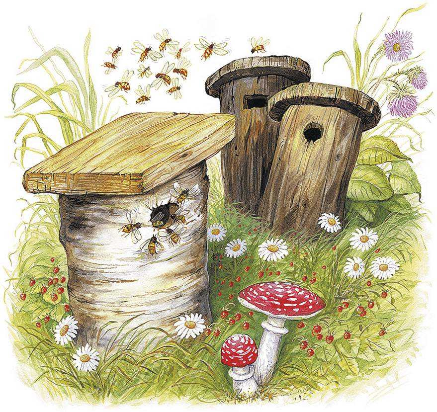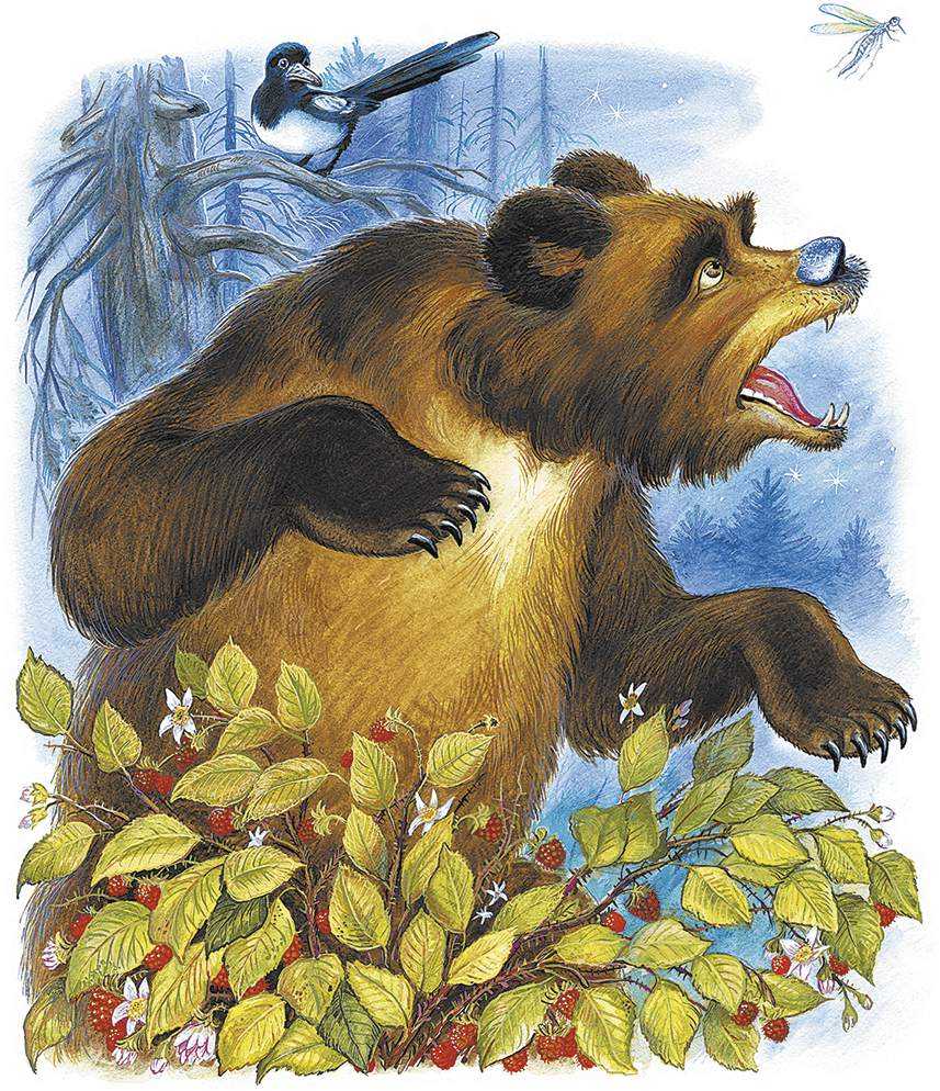 Забрался Медведь под ореховый куст. Закрыл глаза. Задремал. Начал Медведю сон сниться, будто он в лесу на пчелиный улей набрёл, а в улье мёду хоть отбавляй! Запустил Мишка в улей лапу и вдруг слышит: «Дзю-ю-ю!.. Дзю-ю-ю!..» Догнал-таки Комар Медведя. Догнал и разбудил! Звенел Комар, звенел и замолчал. Молчит, будто куда провалился.