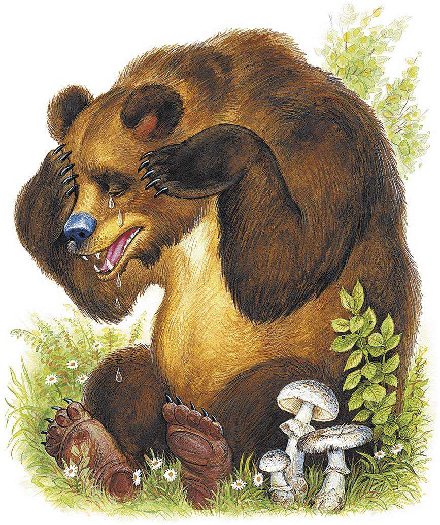 Взошло солнышко. Выспались, проснулись звери и птицы в лесу. Поют, радуются. Только один Медведь не рад новому дню. Утром повстречал его на лесной опушке Заяц. Бредёт лохматый Медведь, еле ноги передвигает. Глаза у него слипаются – так спать хочется.