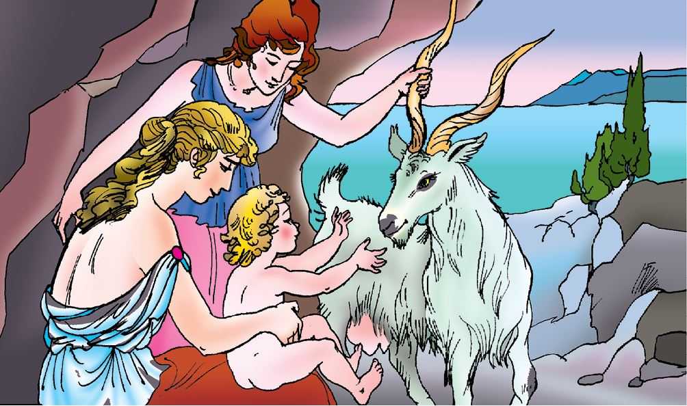 После того, как Крон обрел власть, его повсюду преследовал страх, что его дети так же поступят с ним, как он со своим отцом. Поэтому каждого родившегося своего ребенка от жены Реи, он съедал. Чтобы спасти очередного ребенка, Рея отправилась в одну из критских пещер и родила там Зевса, а Крона обманула и вместо ребенка отдала для поглощения длинный камень. Так Зевс и вырос в пещере, кормом ему служило молоко козы (Амолфея) и мед, приносимый пчелами.