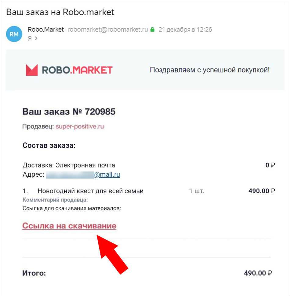 В течение часа после успешной оплаты на указанную вами почту придёт письмо от Robo.market с темой «Ваш заказ на Robo.market» — в нём ссылка на скачивание материалов выделена красным шрифтом.