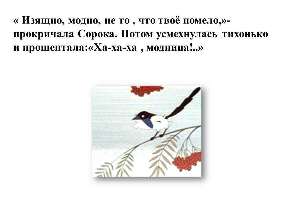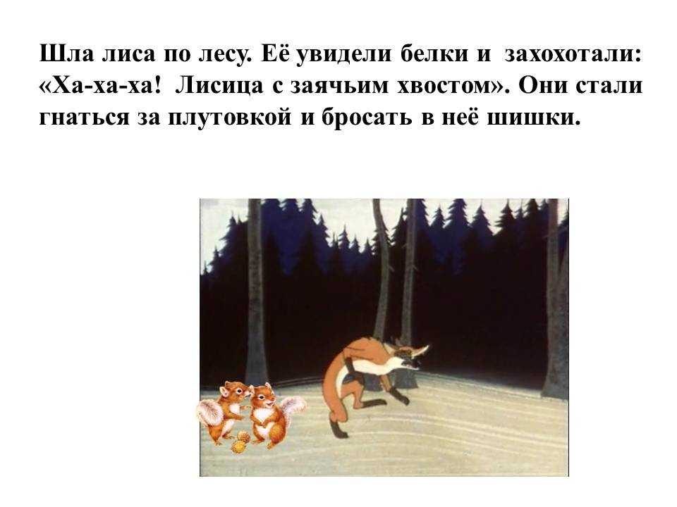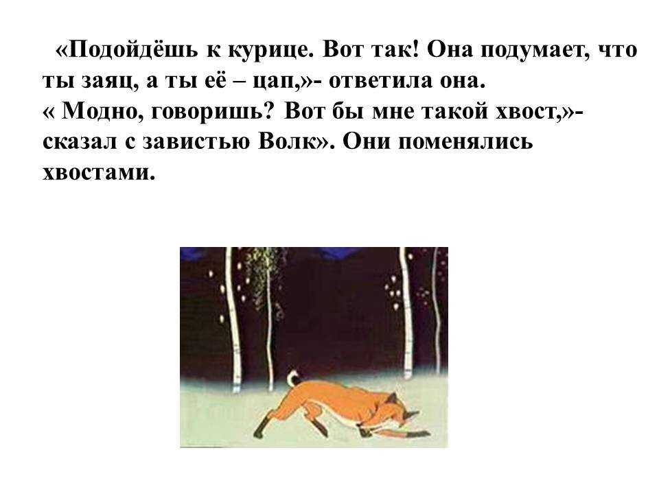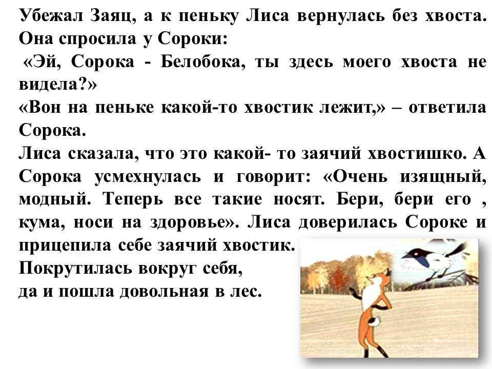 – Что ты, Муха – отвечает Лисица. – Да без хвоста я пропаду. Погонятся за мной собаки, живо меня, бесхвостую, поймают. А хвостом я их обману.