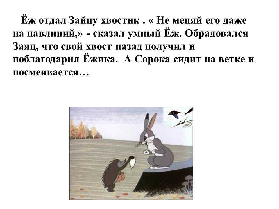 В русской народной сказке «Хвосты» рассказывается о том, что было время, когда все животные были бесхвостыми, и вдруг разнеслась весть по лесу, что будут раздавать хвосты. Удивились животные, но раз дают – надо брать. И потянулись за обновками. Кто пошустрей выбрали хвосты, какие понравились, а медлительным досталось, что осталось. Эта сказка привлекает своей познавательностью. Слушая сказку«Хвосты», дети знакомятся с животными, узнают, как они выглядят. История достаточно простая и ребенок с удовольствием слушает, и сам ее рассказывает.
