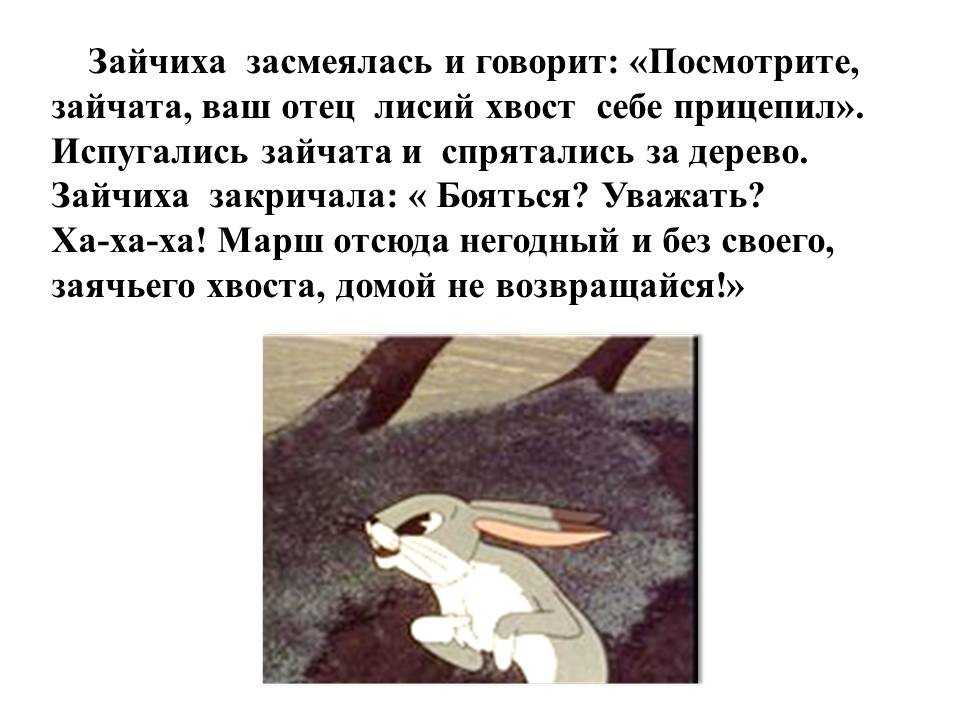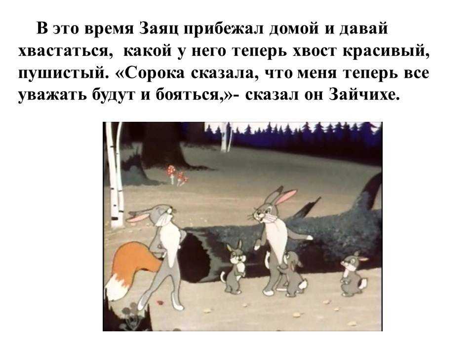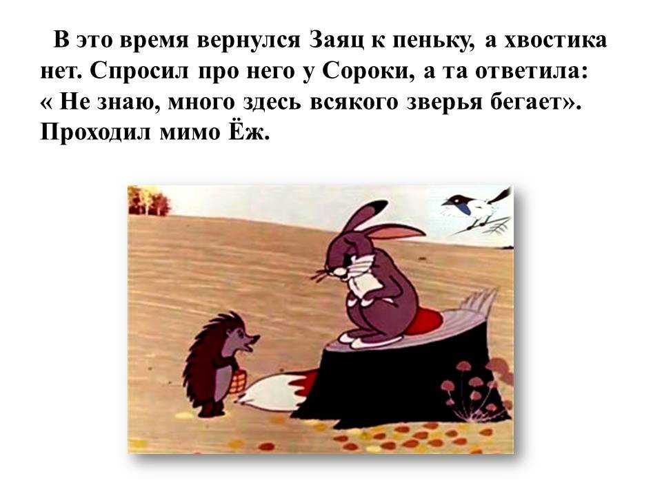 – Дедушка медведь, принёс мне хвостик-то? – Куда тебе там хвост! Я, себе-то, вон какой обрывок достал! – И ушёл. Слышит зайчик – волк бежит. – Дяденька волк, принёс ли мне хвостик-то? – Не до тебя там, косой, было! Я себе насилу выб¬рал, потолще да попушистее – сказал волк и убежал. Бежит лисичка. – Лисичка-сестричка, принесла ли мне хвостик? – спрашивает зайчик. – Забыла, – говорит лиса. – А посмотри, какой я себе выбрала! И начала лиса вертеть хвостом во все стороны. Обид¬но зайчику стало! Чуть не заплакал. Вдруг слышит шум, лай, писк! Глядит – кошка с со¬бакой ссорятся, у кого хвост лучше. Спорили, спорили, подрались.