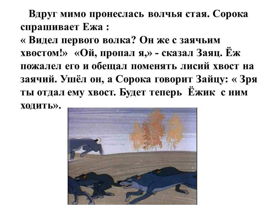 Испугался зайчик: «Забьёт меня дождик!» – спрятался в норку. Сидит и слышит: «тууп-тууп-тупп!». Земля трясётся, деревья трещат. Медведь идёт. – Дедушка медведь, – просит зайчик, – будут там хвосты раздавать, захвати мне, пожалуйста, хвостик! – Ладно, – говорит медведь, – коли не забуду – зах¬вачу! Ушёл медведь, а зайчика раздумье взяло: «Старик он, забудет про меня! Надо кого-нибудь ещё попросить!» Слышит он: «туп-туп-туп!» – волк бежит. Высунулся зайка и говорит: – Дяденька волк, будешь себе хвост-то получать, – выбери и мне какой-нибудь! – Ладно, – говорит волк, – принесу, если останет¬ся! — и убежал. Сидит зайка в норке, слышит, трава шуршит, метётся – лисичка бежит. «Надо и её попросить!» – думает зайчик.