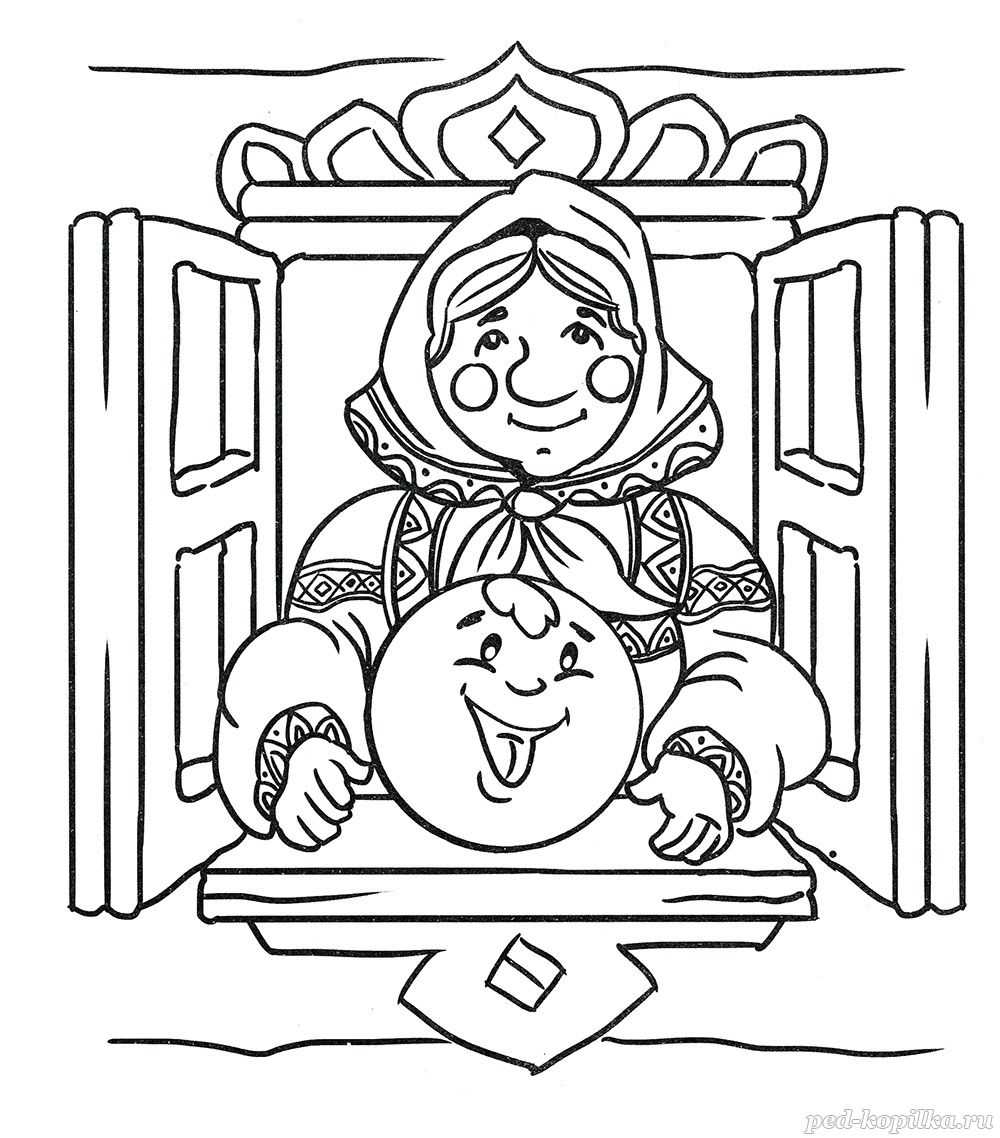 Старуха так и сделала: намела, наскребла горсти две муки, замесила тесто на сметане, скатала колобок, изжарила его в масле и положила на окно простынуть.