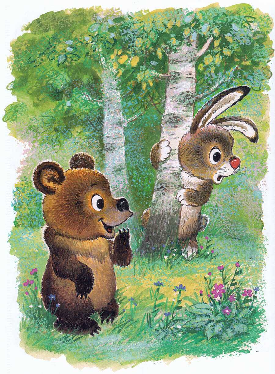 Услыхал песенку лягушонка Зайчонок, выглянул из-за березки и выбежал на опушку. Высунул из кустов мордочку Медвежонок – и тоже заковылял к лягушонку.