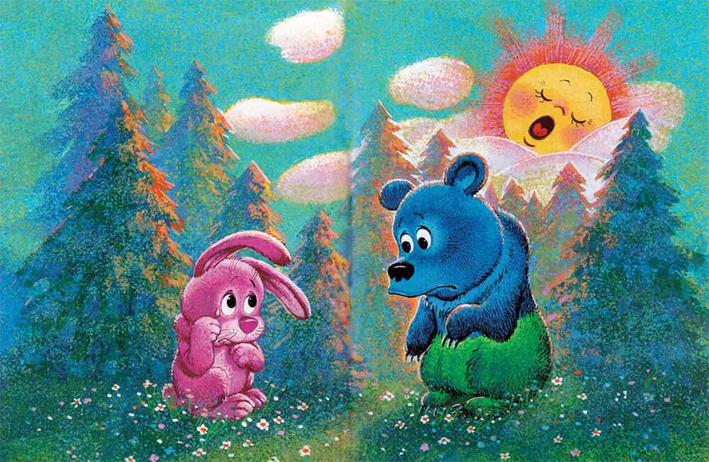 – А ты тоже… до чего же… зелено-синий… Ну, просто совсем… сине-зелененький! – похвалил Зайчонок и погладил Медвежонка по спине.