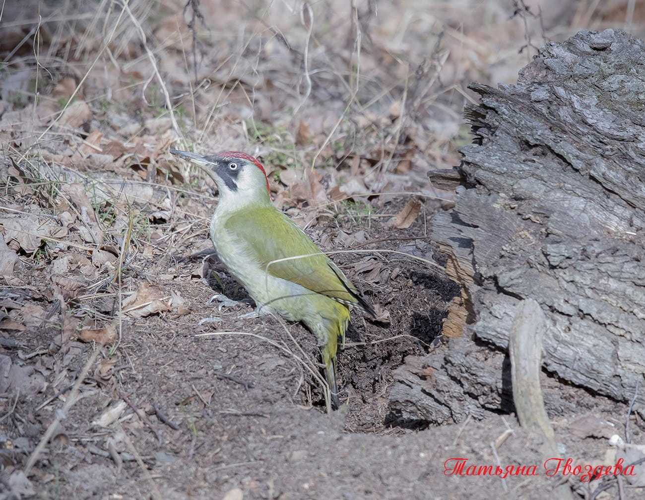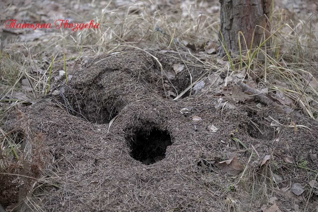 Здесь, на этом муравейнике, поработал зелёный дятел. Ел муравьёв.