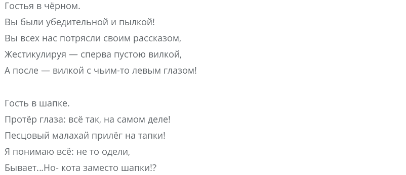 Посмотрите, постовой встал нанашей мостовой,Быстро руку протянул, ловкопалочкой взмахнул.Вы видали? Вы видали?Все машины сразу встали! Дружновстали в три рядаИ не едут никуда.Не волнуется народ – через улицуидет.И стоит у мостовой, как волшебникпостовой.Все машины одному подчиняютсяему.