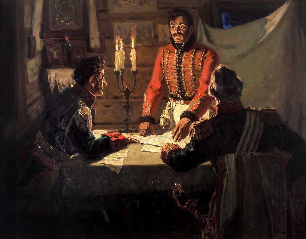А 21 августа 1812 года, в виду деревни Бородино, где он вырос, где уже торопливо разбирали родительский дом на укрепления, за 5 дней до великого сражения, в крестьянском овине при том же Колоцком монастыре Денис и предложит Багратиону идею партизанского отряда (или, как говорили тогда, «поисковой партии»).