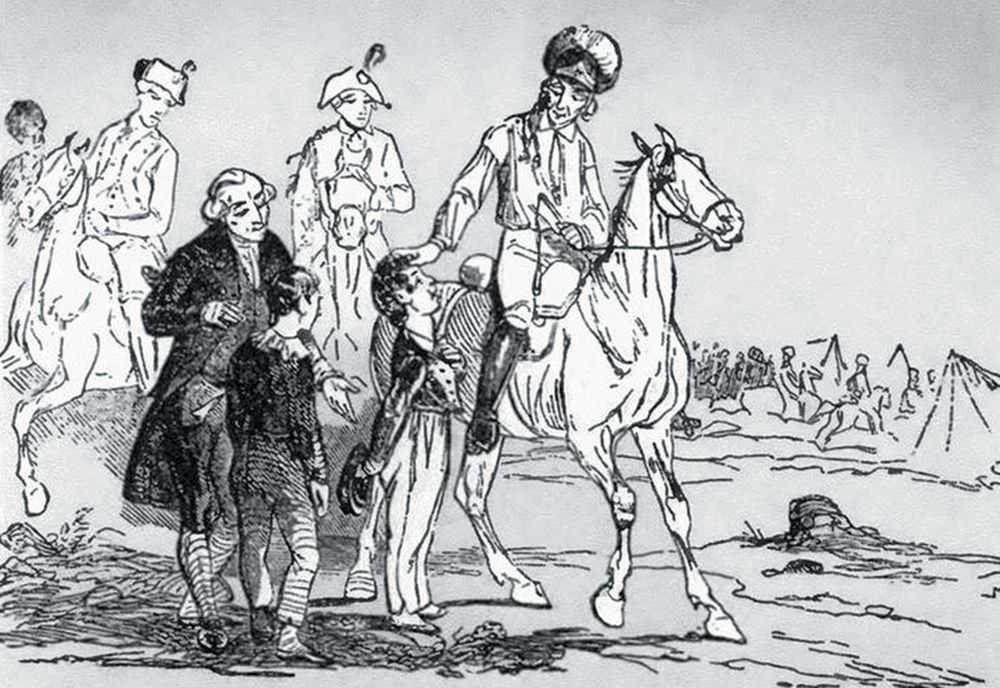 Правда, узнав, что служить будет адъютантом Багратиона — предел мечтаний! — Денис, напротив, закручинился. Он ведь недавно в сатире «Сон» высмеял длинный багратионовский нос. Более того, знал — стихи эти известны генералу. Позже, на фронте, тот при Давыдове расскажет о них Ермолову, и наш пиит, оправдываясь, улыбнется: «При всех свидетельствую, что затронул столь известную часть вашего лица единственно из зависти, поскольку сам оной части почти не имею». И укажет на свой нос — пуговкой. Все посмеются. А через несколько дней, когда Денис прискачет однажды к Багратиону со спешным донесением и, запыхавшись, крикнет: «Главнокомандующий приказал доложить, что неприятель у нас на носу, и просит вас немедленно отступить!», Багратион невозмутимо заметит: «На чьем носу неприятель? Ежели на вашем, так близко; а коли на моем, так мы успеем отобедать еще…»