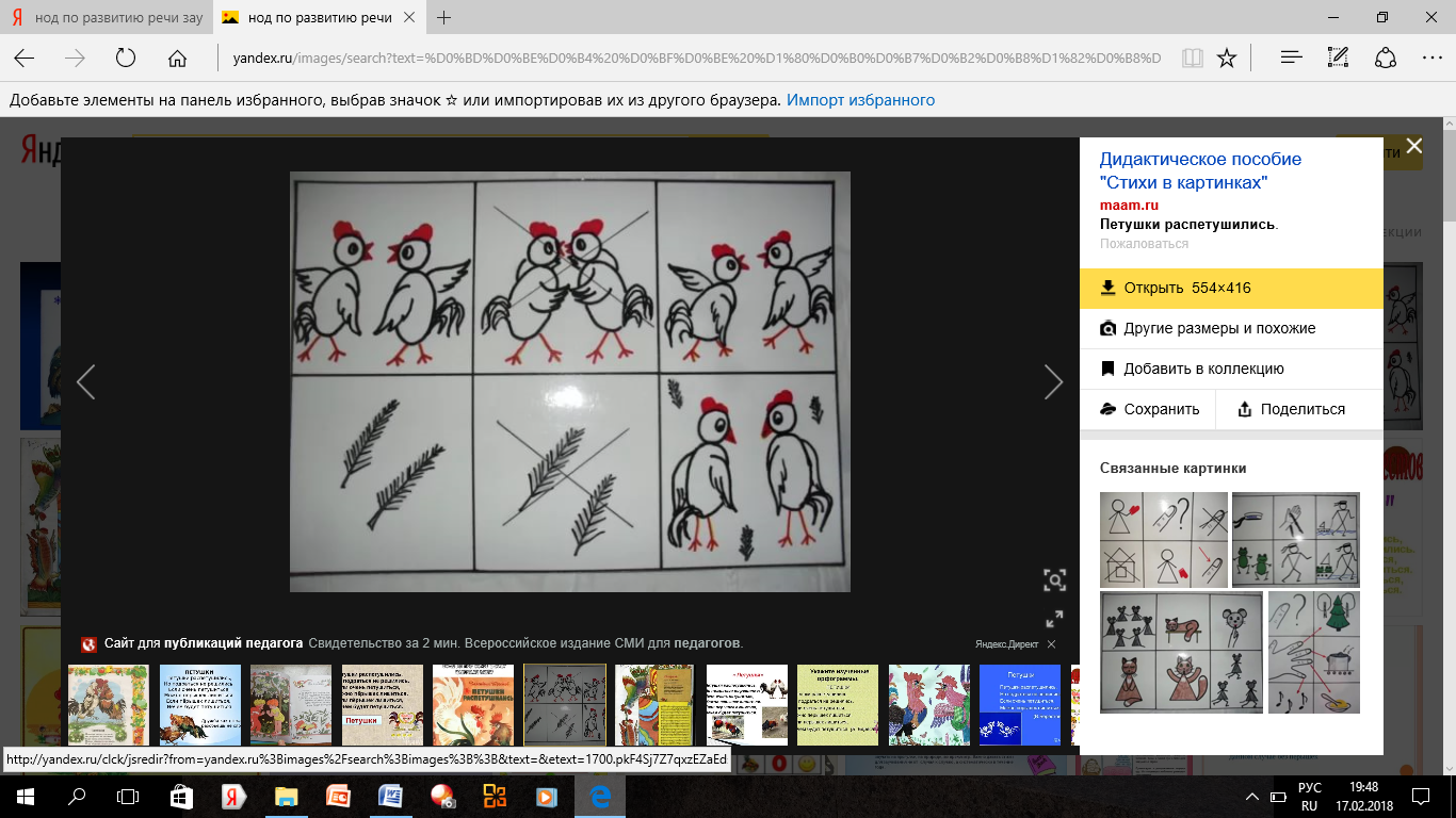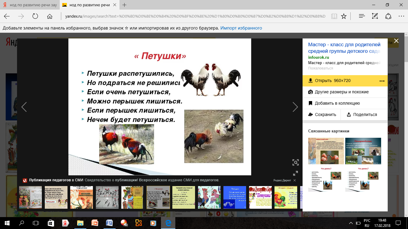 Материалы и оборудование: предметные картинки по теме (петушки), перья.