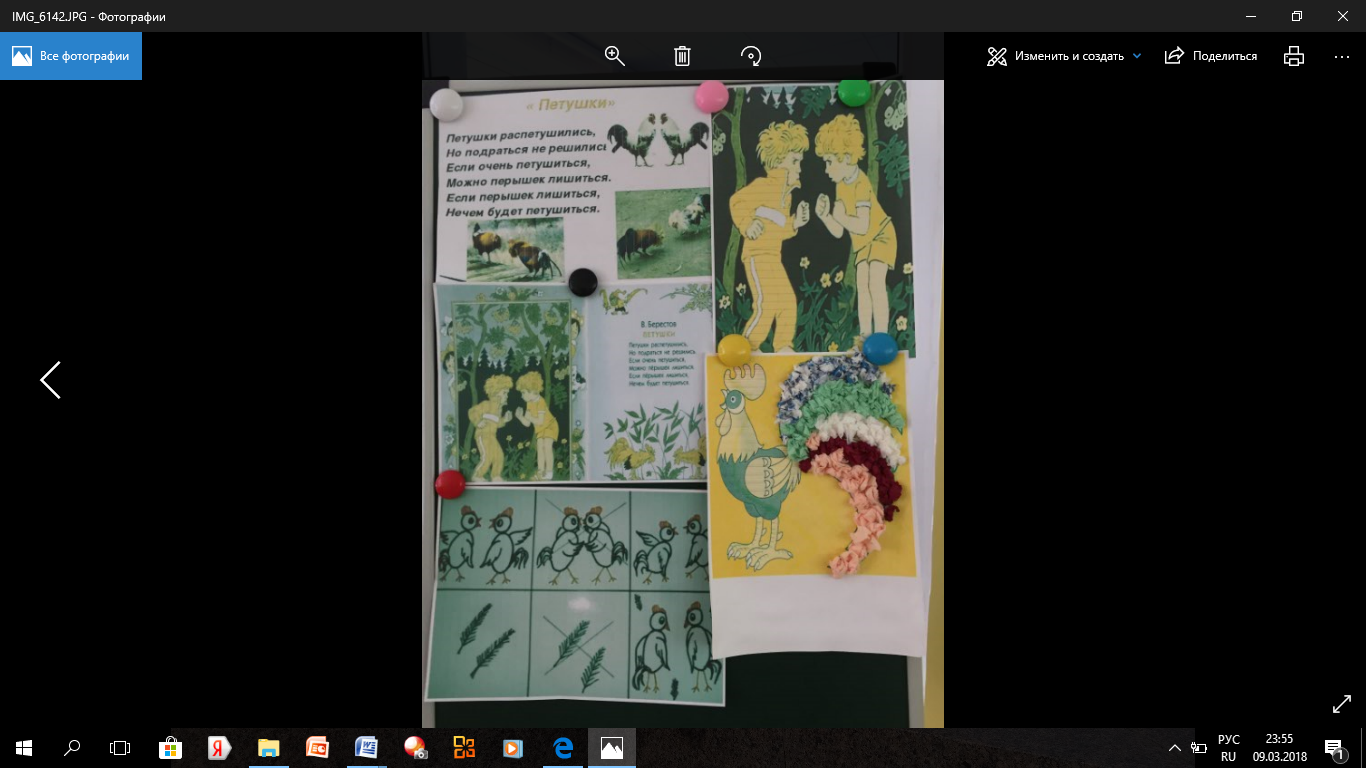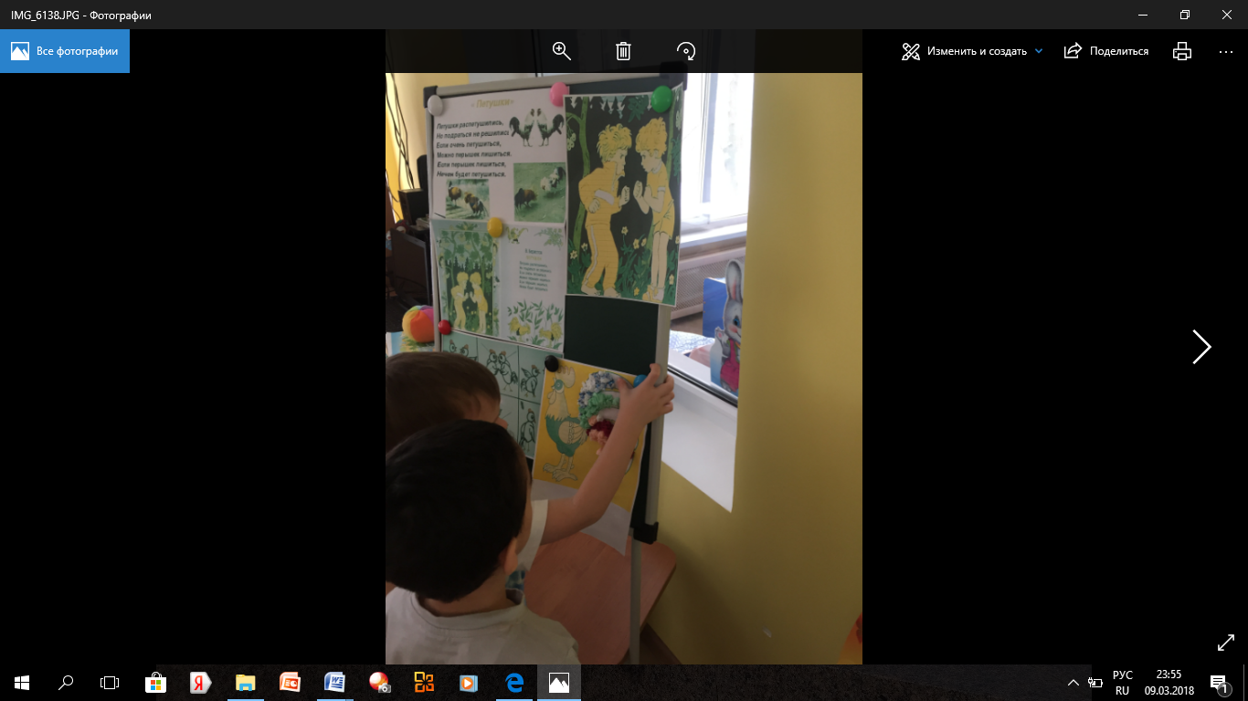 Воспитатель: Вот какой красивый стал у нас петушок. Давайте ему напомним, что же будет, если ссориться и петушиться. Еще раз вместе с воспитателем читают стихотворение «Петушки распетушились». 1-2 ребенка индивидуально.