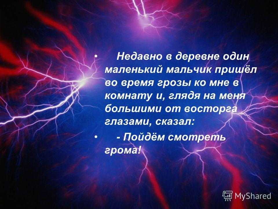 Недавно в деревне один маленький мальчик пришёл во время грозы ко мне в комнату и, глядя на меня большими от восторга глазами, сказал: — Пойдём смотреть грома!