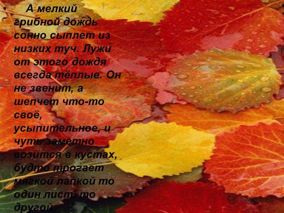 Осень — это прекрасная пора. Вокруг всё жёлтое, разноцветное, особенно опавшие листочки, которые так и манят взять их в руки. Каких только цветов они не бывают — и золотые, и красные, и оранжевые. Но больше всего мне нравится наблюдать такое явление природы, как осенний дождь. Причём именно грибной дождь, спокойный и мелкий, который идёт, когда светит солнце. Неторопливый душ с неба омывает всё: деревья, листочки, ягодки, растущие в лесу. Впитав эту живительную влагу, начинают буйно расти грибы. У грибников начинается сезон «тихой охоты».