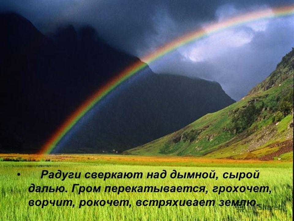 Радуги сверкают над дымной, сырой далью. Гром перекатывается, грохочет, ворчит, рокочет, встряхивает землю.