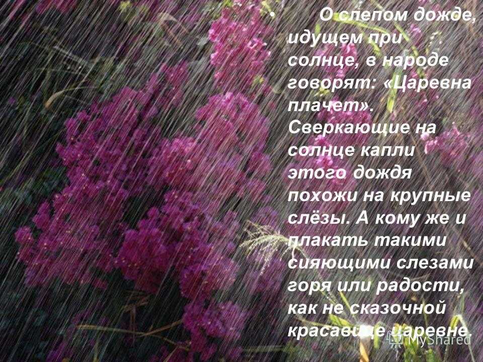 О слепом дожде, идущем при солнце, в народе говорят: «Царевна плачет». Сверкающие на солнце капли этого дождя похожи на крупные слёзы. А кому же и плакать такими сияющими слезами горя или радости, как не сказочной красавице царевне.