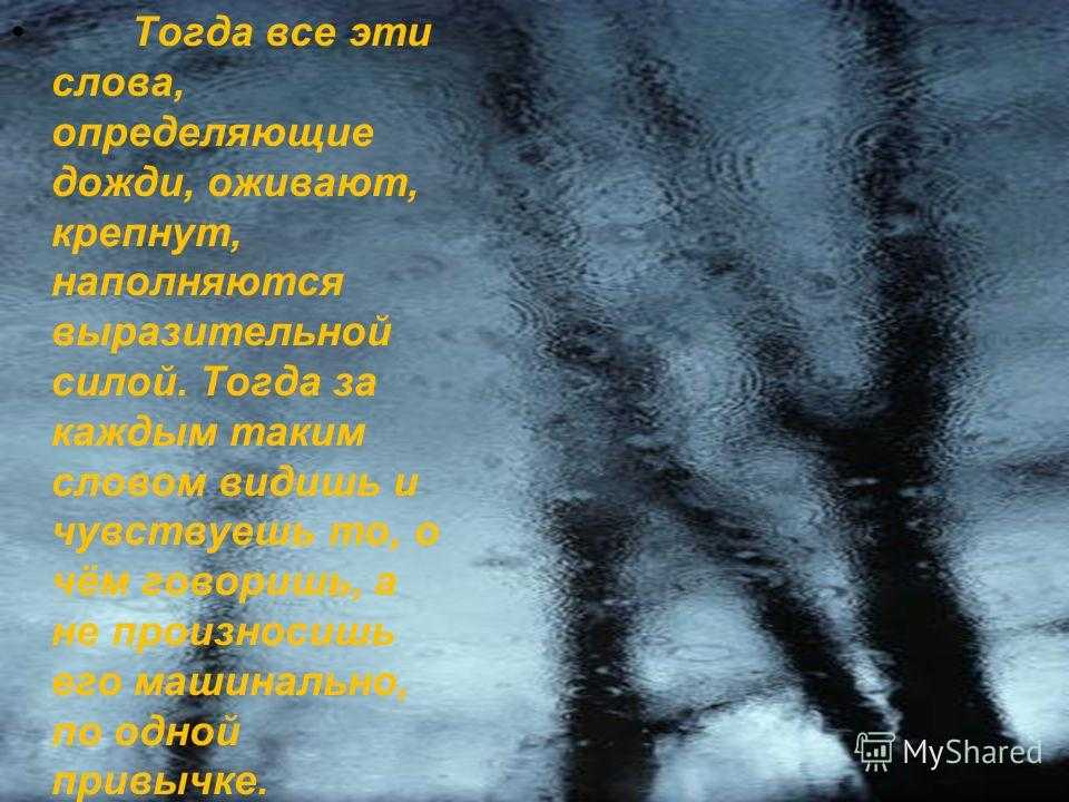 Тогда все эти слова, определяющие дожди, оживают, крепнут, наполняются выразительной силой. Тогда за каждым таким словом видишь и чувствуешь то, о чём говоришь, а не произносишь его машинально, по одной привычке.
