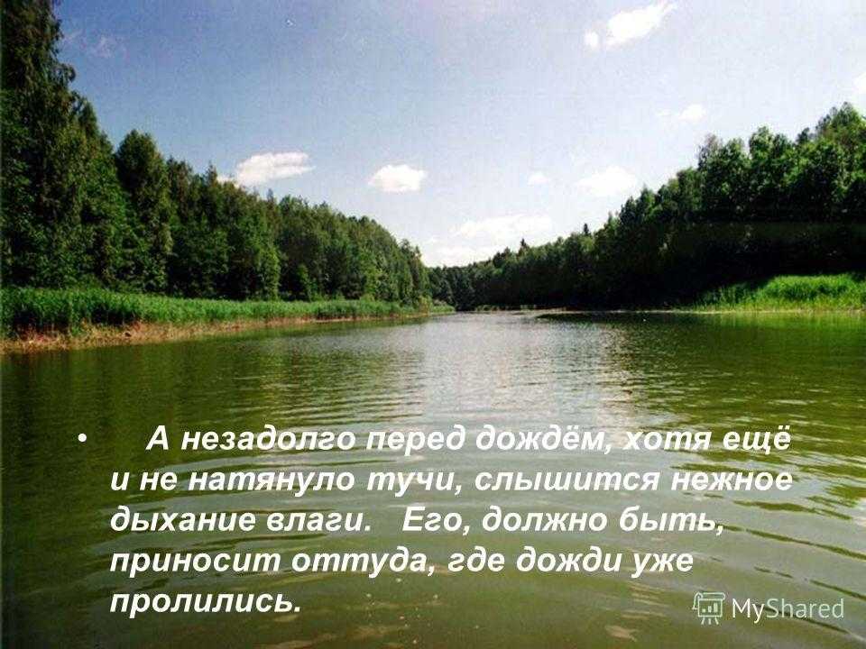 А незадолго перед дождём, хотя ещё и не натянуло тучи, слышится нежное дыхание влаги. Его, должно быть, приносит оттуда, где дожди уже пролились.