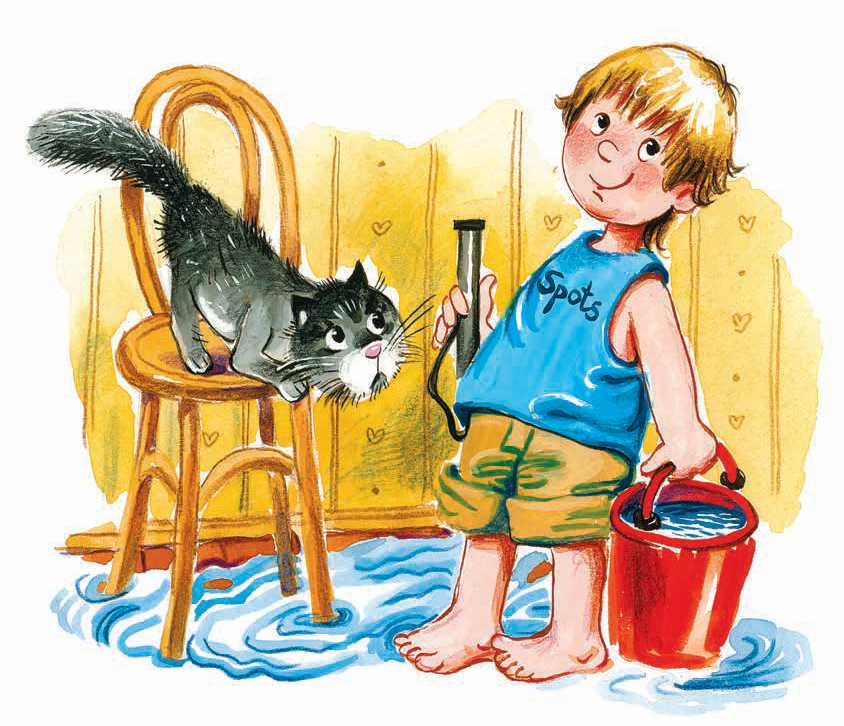 Трах! – опрокинул ведро и пролил всю воду. Но я решил, так даже лучше. Так гораздо удобнее мыть пол. Вся вода на полу; тряпкой три – и всё дело. Воды маловато, правда. Комната-то у нас большая. Придётся ещё ведро воды на пол вылить. Вылил ещё ведро, вот теперь красота! Тру тряпкой, тру – ничего не выходит. Куда же воду девать, чтобы пол был сухой? Без насоса тут ничего не придумать. Велосипедный насос нужно взять. Перекачать воду обратно в ведро.