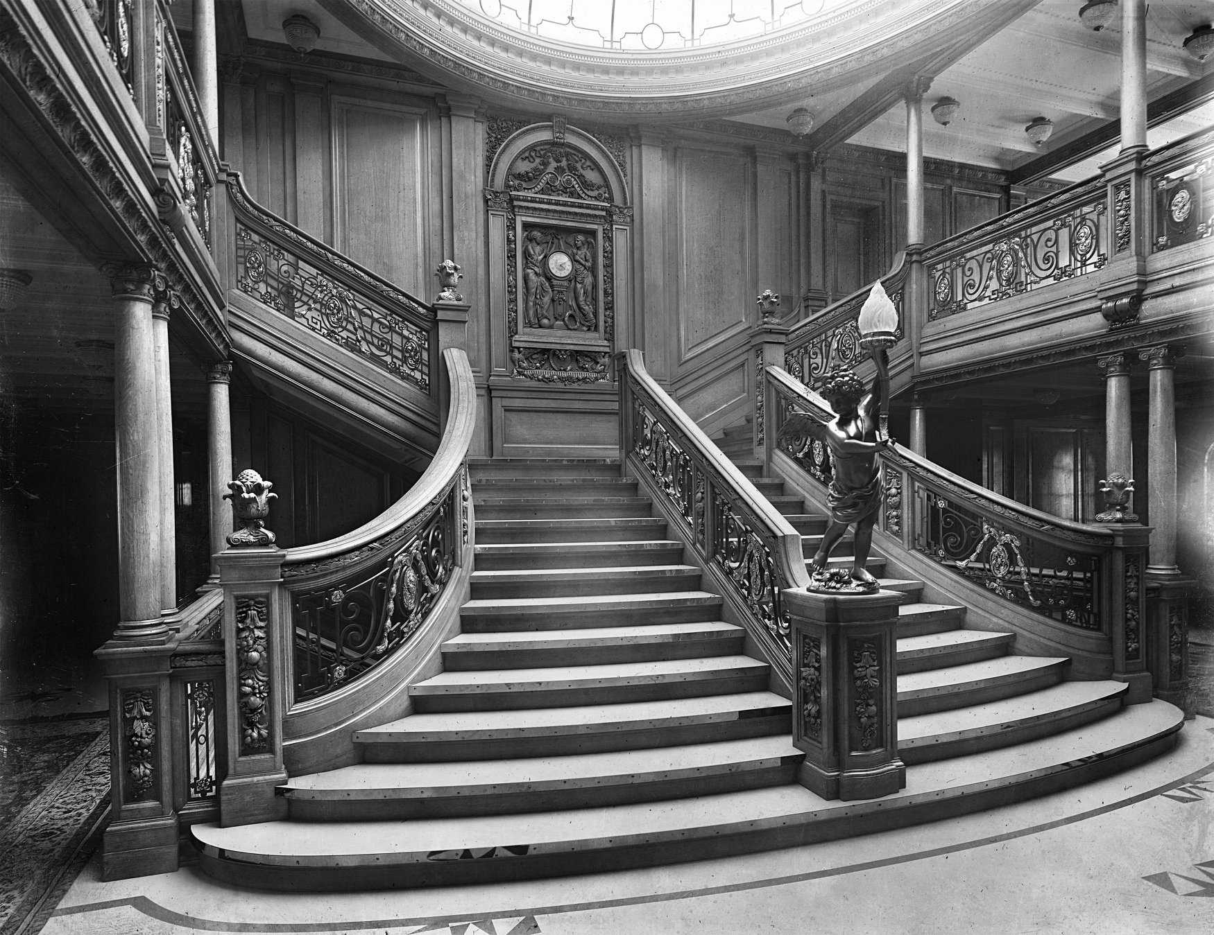 Рендер знаменитой парадной лестницы «Титаника» с видом на часовую панель, херувима и пролет лестницы со шлюпочной палубы